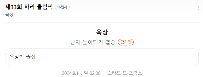 | 목차 1. 파리올림픽 높이뛰기 우상혁 결승 1) 우상혁 높이뛰기 경기일정 2) 우상혁 높이뛰기 실시간 중계보기 2. 파리올림픽 높이뛰기 결선 진출자 명단 3. 항저우 아시안게임 높이뛰기 우상혁 1) 경기결과 및 하이라이트 영상(은메달) |