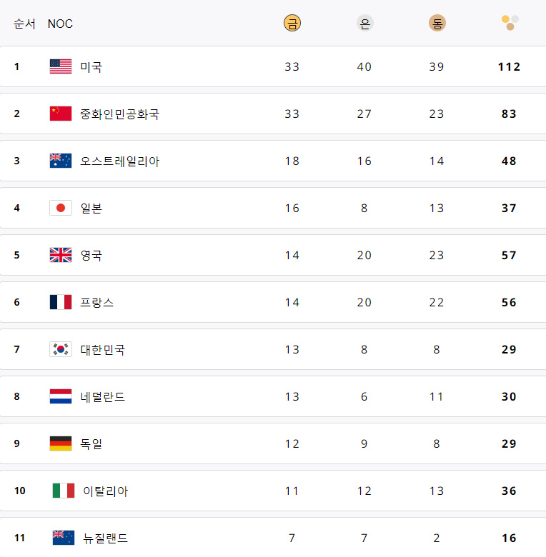 2024 파리 올림픽 실시간 메달 종합 순위 - Deuki Cast
