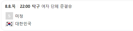 탁구 여자 단체 준결승은 8월 8일 오후 10시에 열릴 예정입니다.