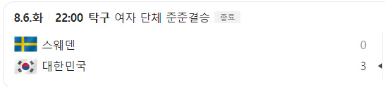 8월 6일 오후 10시, 2024 파리올림픽 탁구 여자 단체 8강 대한민국과 스웨덴의 경기가 열렸습니다. 결과는 3-0으로 대한민국이 우승하며 준결승에 진출하게 되었습니다.
