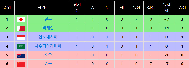 C조는 일본, 바레인, 인도네시아, 사우디아라비아, 호주, 중국 총 6개국이며 순위는 다음과 같습니다.