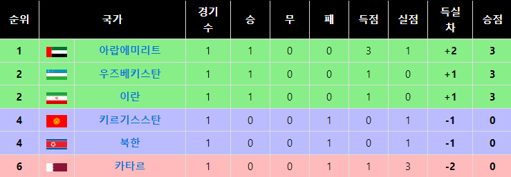 A조는 아랍에미리트, 우즈베키스탄, 이란, 키르기스스탄, 북한, 카타르 총 6개국이며 순위는 다음과 같습니다.