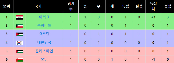 B조는 이라크, 쿠웨이트, 요르단, 대한민국, 팔레스타인, 오만 총 6개국이며 순위는 다음과 같습니다.